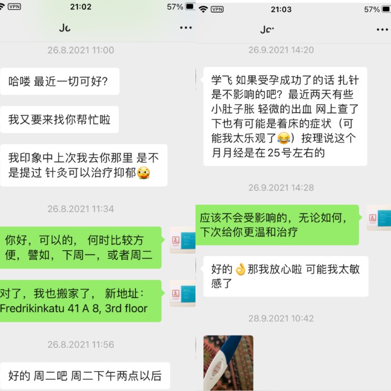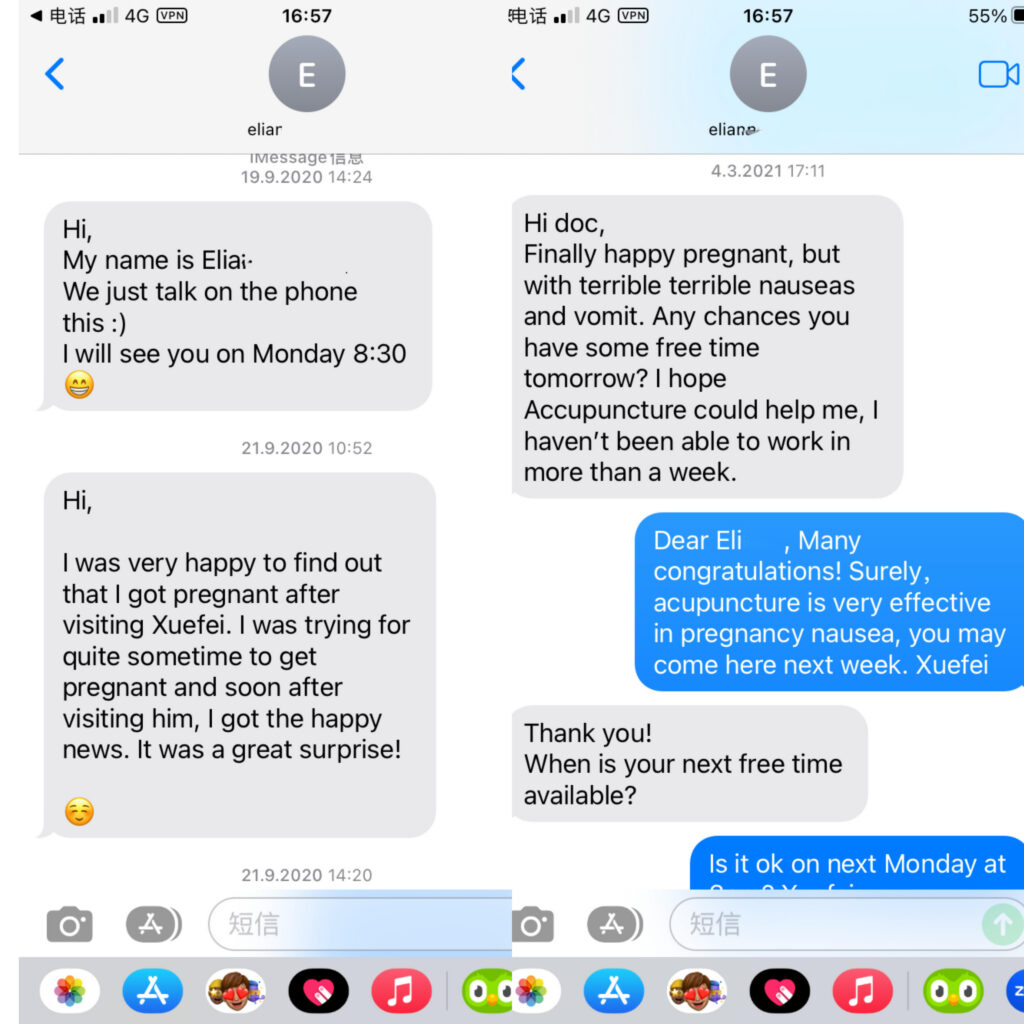 This lady had a right side salpingectomy few years ago, therefore it was difficult for her getting pregnant. Her first visit was on Feb 8, 2022, and with the help of comprehennsive treament by acupucunture, Tuina massage and fire-cupping, she got pregnant in March 2022 after 5-session only.